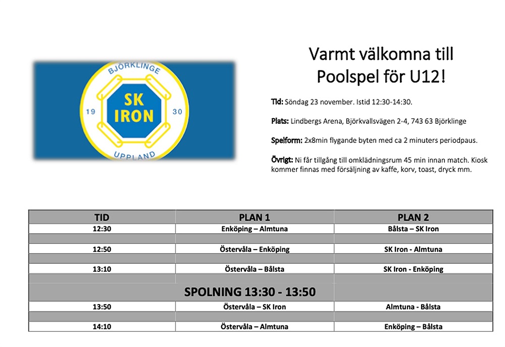 4 Matcher hos Iron, bifogar spelschema. Poolspelet flyttat till Söndagen från tidigare Lördag. Full gas!
